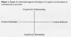 Measuring Language Dominance and Bilingual Proficiency Development of Tarahumara ChildrenCarla PaciottoThis paper presents an analysis of language dominance and oral bilingual proficiency of Tarahumara-Spanish speaking children from northern Mexico within the framework of Cummins' model of bilingual proficiency development. The children were assessed through a bilingual interview, which allowed for the testing of language dominance along with the constructs of BICS and CALP and language interdependence in the oral domain. Preliminary findings indicate that these constructs are applicable to a context where the two languages are in a relation of diglossia with children entering school as bilingual speakers dominant in Tarahumara and the native language is not used as a medium of instruction.Bilingual educational programs for minority language students are still contentious in most multilingual regions of the world. In general, proficiency in the dominant language has been considered by program developers and teachers to be the solution to the obstacles that a high number of language minority children encounter in school. In order to reach this goal, monolingual programs in the second/dominant language and transitional bilingual programs are commonly perceived as more effective than additive programs that foster the development of first and second language literacy. This perception is based on the rationale that, since school success is a function of proficiency in the dominant language, it is "common sense" to provide maximum exposure to the second/dominant language as quickly as possible. These beliefs and corresponding instructional practices persist in spite of the conspicuous evidence of the learning advantages that additive bilingual and biliteracy education programs present for language minority children over monolingual and transitional bilingual practices. Among the second language learning models that illustrate such advantages, Cummins' (1979, 1996, Cummins & Swain, 1986) psycholinguistically oriented theoretical model of bilingual proficiency has gained wide support over the last 20 years. In spite of the critiques of Cummins' model, which are beyond the scope of this article (Edelsky, 1996; Edelsky et al., 1983; Martin-Jones & Romaine, 1986), this has been considered as offering a strong explanation of how the development of academic language skills (higher-order cognitive knowledge) in the first language (L1) facilitates and strengthens the development of academic skills in the second language (L2) through a process of cognitive transfer. Over the years, Cummins' model has been refined and tested through studies carried out primarily within the contexts of language minority education for immigrant students in the U.S.A., Canada, Europe, and Australia. The research of interest here relates to the examination of Cummins' model in the analysis of bilingual proficiency of students who are native speakers of an indigenous language. Specifically, the present investigation follows a recent research direction in this area (Francis, 1997, 1999, 2000) that focuses on how Cummins' framework can help to describe bilingual proficiency development within a diglossic language contact situation, where an indigenous language holds a subordinate prestige-value, a restricted functional domain, and is not used as a medium of instruction. First, a brief description of Cummins' model for the study of bilingual proficiency is provided as the theoretical framework of relevance. Cummins' framework Among the most important theoretical constructs proposed by Cummins since his early work (1979) is the distinction he made between the development of conversational language (also termed basic interpersonal communicative skills or BICS) and academic language proficiency (also termed cognitive academic language proficiency or CALP). This construct postulates that every first language learner develops a language proficiency for face-to-face daily conversation, which Cummins calls conversational language and also defines as "surface level fluency" or "basic fluency" in the native language. L1 conversational proficiency is usually reached around six years of age. Children who enter school taught in a L2 take from two to three years to develop a peer-appropriate conversational fluency in the L2 (Cummins, 1997; Collier, 1995). Conversational language represents a distinct--but not unrelated--level of language development from academic language proficiency, which is developed with school experience and continues throughout life. In the context of schooling for minority language students, CALP development in a second language usually follows BICS development and takes from five to seven years. It is important to emphasize that the distinction between conversational and academic language does not refer to two opposing dimensions of language acquisition, but rather to language tasks and activities that are characterized by different degrees of (1) cognitive effort/involvement and (2) contextual information and clues needed to process those tasks. These two dimensions are conceived as two intersecting continua: (A) context-embedded vs. context-reduced and (B) cognitively undemanding vs. cognitively demanding communicative events (see Figure 1). At one extreme of the (A) continuum, we find communicative events typical of everyday face-to face conversation where "the participants can actively negotiate meaning ... and the language is supported by a wide range of meaningful paralinguistic and situational clues" (Cummins, 1986, p. 154). This type of activity is also cognitively-undemanding since the "active cognitive involvement" (Cummins, 1997, p. 58) is low when processing language. On the other end of the continuum, we find context-reduced communication, which "depends heavily on knowledge of the language itself" (Cummins & Swain, 1983, p. 36) and is characteristic of school-related tasks. An example of such activity i