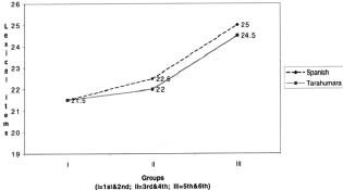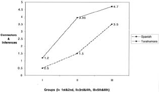 Section 1, 2, and 3a, were respectively considered as providing a measure of conversational proficiency, testing the ability to produce everyday vocabulary, understand and answer intelligibly simple questions, and produce grammatically acceptable texts. On the other hand, 3b was considered as providing a simple measure of discourse competence, as signaled in the texts by (1) the ability of the students to make inferences, where inferences "form an important part of the higher levels of literacy" (Olson, 1991, p. 263) and (2) students' use of connectors to build coherent texts, where coherence is defined as "the ability to arrange ideas in logical sequence and organize meanings effectively" (Cummins, 1986, p. 113). Limitations of the Instrument: The fact that the instrument does not look for specific language-bound grammatical features allows for its use in testing bilingual speakers of any language. Its manageability and easiness of administration and scoring allow teachers to carry it out without any specialized knowledge of linguistics and without the need for extensive training. However, because it does not look for specific items, the interview cannot clearly identify distinctions between intermediate, advanced, or native-like speakers proficiency, rather it provides a general estimation of language dominance. Administration of the Bilingual Interview: The administration of the interview was carried out by two different interviewers--myself and a bilingual teacher, who was a native speaker of the Tarahumara variant spoken by the children under study. The designated teacher-assistant taught kindergarten and had been teaching at the same school for five years, and almost all the children were familiar with her and recognized that she was a fluent speaker of Tarahumara. In my case, I waited for a few months before administering the interview, giving the children a chance to become accustomed to my presence. By the time I started interviewing, I had substituted as a teacher for all of the classes, interacted with every grade in the various classrooms, participated in school activities, and played with children during morning and afternoon recess for three months. During the administration of the interview, the majority of the children seemed to enjoy the one-on-one attention and the picture-description tasks. Only one first grader refused to speak during the interview and had to be excluded from the sample. However, some children were shy and did not always appear to be comfortable with the one-on-one interaction with adults and often needed repeated prompting to respond. The teacher-assistant who administered the Tarahumara part of the interview also encountered a similar situation. She noticed that some children were "slow in answering" and that with some children she had to repeat the questions a few times. Her observations indicated that the data was collected under similar constraints and could be compared, despite the use of two interviewers. The teacher also felt that the production of the free narration was somewhat "stiff." Comparing her class experience, she said that children in her kindergarten class usually speak longer and "invent" a lot more. On one level, she confirmed the fact that children in the lowest grades and in kindergarten are familiar with picture description and story telling; on another level, she indicated that the interview process might elicit somewhat contrived responses. Sampling: In the Tlaxcala study the subjects were selected from three grades: second, fourth, and sixth. The bilingual interview was only one part of a large battery of tests, whose general objective was to examine the students' reading and writing abilities in light of the children's oral proficiency across grades. The school had 400 enrolled children; the bilingual students were sampled by asking teachers to make a list of students belonging to high, medium, and low reading and writing skills in order to be representative. In the case of the present phase of the study, all the grades were included in the sample, since oral bilingual data across the grades was deemed crucial to the understanding of the relationship between teacher language use in the class and the children's language skills. Especially in the case of first graders, their language proficiency and dominance profiles were important in order to understand the quality of their experience during the first phases of literacy training. All the Tarahumara children enrolled were rarely in school at the same time, and on average only 90 attended regularly. Because the 3rd, 5th, and 6th graders were very few, all of them were included in the sample. First and second graders were chosen randomly. Monolingual Spanish speakers, who represented a minority population in every class, were excluded from the sample. Their monolingualism was determined by the teachers and confirmed by observational data. Also, four students whose first language was Spanish and were said to be beginning learners of Tarahumara as a second language in school were excluded from the analysis. Both these groups were considered nonrepresentative of the majority Tarahumara-speaking student group. In total, the sample of children interviewed was 66 children from the first through the sixth grade. 1st grade = 13 (5 girls, 8 boys)Results All the children interviewed, with the exception of one, produced a complete language sample at least in one language and showed sensitivity to the separation of codes. For the statistical analysis of the data, the six grades were clustered in three groups, where the first and second (Group I), third and fourth (Group II), and fifth and sixth (Group III) grades were paired in order to have larger sample sizes. This combination also reflected the fact that in reality the 3rd and 4th and the 5th and 6th grades were attending two-grade classrooms. Language dominance: In order to establish students' language dominance, the scores from both