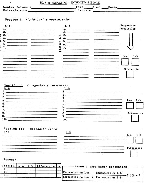 Finally, the fact that the level of textual complexity in Tarahumara is equivalent to or above the level of Spanish could be viewed as consistent with Cummins' affirmation that "transfer is much more likely to occur from minority to majority language because the conditions of exposure and motivation are met, whereas this is usually not so in the opposite direction" (Cummins, 1988, pp. 156-157). In this perspective, students' oral academic skills in Spanish, their weaker language, could be in a process of "catching up" with their oral native language skills. However, considering there is a slow closing of the gap between the ability to produce narration in Tarahumara and Spanish, it could be hypothesized that Spanish instruction is allowing for a steady growth of Spanish academic language, while the trend of Tarahumara discourse skills reflects the lack of "nourishment" by school instruction. Conclusions The preliminary results reported here provide evidence that even in a case of diglossic relationship between the native and the second language, where the native language is not employed for school instruction, the basic processes of oral bilingual proficiency development proposed by Cummins are applicable. The question to be answered at this point is whether there is indeed a correlation between literacy skills and oral proficiency demonstrated by the Tarahumara children. This answer will be the object of the next phase of the study. The present research shows that the Entrevista Bilingüe can provide teachers of bilingual children and researchers of bilingual education with systematic information--to add to observational data--for estimating a student's language dominance and proficiency and to study the basic processes of oral bilingual proficiency development. All this information could be helpful for instructional choices. However, one has to keep in mind that the findings presented here also indicate that the production of bilingual vocabulary lists in a diglossic language contact situation might not be a reliable way to estimate students' language dominance and proficiency; on the other hand, such information is provided by conversation (question and answer) and free narration tasks. Finally, through a simple assessment such as the Entrevista Bilingüe, teachers could easily differentiate and assess levels of conversational abilities of their students vis-a-vis academic abilities related to the production of narration. References Biber, D. (1986). Spoken and written textual dimensions in English: Resolving the contradictory findings. Language, 62, 384-414. Collier, V. P. (1995). Second-language acquisition for school: Academic, cognitive, sociocultural, and linguistic processes. In J. E. Alatis et al. (Eds.), Linguistics and the education of language teachers: Ethnolinguistic, psycholinguistic, and sociolinguistic aspects (Georgetown University Round Table on Language and Linguistics). Washington, DC: Georgetown University. Cummins, J. (1997). Putting language proficiency in its place: Responding to critiques of the conversational/academic language distinction. Unpublished manuscript. Cummins, J. (1996). Negotiating identities: Education for empowerment in a diverse society. Ontario, CA: California Association for Bilingual Education. Cummins, J. (1988). Second language acquisition within bilingual education programs. In L.M. Beebe (Ed.), Issues in second language acquisition: Multiple perspectives New York: Newbury House. Cummins, J. (1979). Cognitive/academic language proficiency, linguistic interdependence, the optimum age question and some other matters. Working Papers on Bilingualism, 19, 121-129. Cummins, J., & Swain, M. (1986). Bilingualism in education: Aspects of theory, research and practice. New York: Longman. Cummins, J., & Swain, M. (1983). Analysis-by-rhetoric: Reading the text or the reader's own projections? A reply to Edelsky et al. Applied Linguistics, 4(1), 23-41. Danesi, M. (1986). The heritage language classroom and academic support system: A proposal for discussion. Multiculturalism, 9, 15-18. Edelsky, C. (1996). With literacy and justice for all: Rethinking the social in language and education. London: Taylor and Francis. Edelsky, C., Hudelson, S., Flores, B., Barkin, F., Altwerger, B., & Jilbert, K. (1983). Semilingualism and language deficit. Applied Linguistics, 4(1), 1-22. Feldman, C. F. (1991). Oral metalanguage. In D. Olson & N. Torrance (Eds.), Literacy and orality (pp. 47-65). Cambridge, UK: Cambridge University. Francis, N. (2000). The shared conceptual system and language processing in bilingual children: Findings from literacy assessment in Spanish and Nahuatl. Applied Linguistics, 21, 170-205. Francis, N. (1999). Bilingualism, writing, and metalinguistic awareness: Oral-literate interactions between first and second languages. Applied Psycholinguistics, 20, 533-561. Francis, N. (1997). Malitzin: Bilingüismo y alfabetizacion en la Sierra de Tlaxcala (México). Quito, Ecuador: Abya-Yala. Francis, N. (1992). Evaluación del bilingüismo: Una propuesta metodológica. America Indígena, 52, 51-74 Martin-Jones, M., & Romaine, S. (1986). Semilingualism: A half-baked theory of communicative competence. Applied Linguistics, 7(1), 26-38. Olson, D. (1991). Literacy and metalinguistic activity. In D. Olson & N. Torrance (Eds.), Literacy and orality (pp. 47-65). Cambridge, UK: Cambridge University. Skutnabb-Kangas, T., & Toukomaa, P. (1976). Teaching migrant children's mother tongue and learning the language of the host country in the context of sociocultural situation of the migrant family. Helsinky: The Finnish National Commission for UNESCO. Tannen, D. (1985). Relative focus on involvement in oral and written discourse. In D. R. Olson, N. Torrance, & A. Hildyard (Eds.), The nature and consequences of reading and writing (pp. 124-147). Cambridge, UK: Cambridge University. Appendix Bilingual Interview