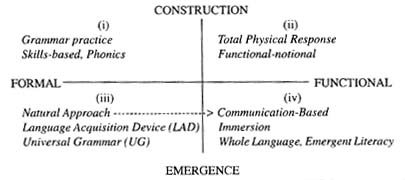 As indicated in Figure 1, the four sections or quadrants of this framework of approaches to language teaching are: (i) formal-construction, (ii) functional-construction, (iii) formal-emergence, and (iv) functional-emergence. Several language teaching approaches have been placed into the four quadrants, based on the degree to which each adopts specific assumptions regarding language and language learning. Specific approaches are discussed in detail below. In addition to approaches that primarily adopt one of these four perspectives, a fifth type of language teaching is one that is eclectic, using activities from more than one quadrant of the framework. The dimensions of this model are presented in a very simple way, as dichotomies. Consequently, the model could be significantly enriched if the axes were treated as continua which acknowledge that language is both form and function and that language learning results from some active construction by the learner as well as from biological and cognitive abilities that respond to normal communicative interaction and input. In addition, the model could be enriched by adding other dimensions of assumptions within language teaching. However, this simplistic categorization of teaching approaches may be valuable for educators because it indicates the assumptions that are adopted by certain approaches to language teaching. Categorizing approaches to indigenous language teaching A number of approaches to indigenous language teaching are characterized in terms of their explicit use of Western approaches. The majority of the examples are found in the published proceedings of Stabilizing Indigenous Languages Symposia (Cantoni, 1996; Reyhner, 1997; Reyhner et al., 1999). Examples are discussed in relation to the four quadrants as well as to an eclectic approach that includes activities from more than one quadrant. Formal-construction: Within Western approaches to language teaching, examples of formal-construction approaches include the Grammar-Translation, Audiolingual, Skills-based, and Back-to-the-Basics/Phonics approaches (cf. Langan, 1999; Larsen-Freeman, 1986; Richards & Rogers, 1986). Historically, many early approaches to indigenous language teaching adopted formal-construction assumptions. To a certain extent, this early trend can be attributed to the dominance of the structural linguistic paradigm (with its emphasis on phonology, morphology, and syntax) in North America and to the involvement of structural linguists in the description, preservation, and teaching of indigenous languages. The emphasis on grammatical structures and practice can be seen in the following directive from a Cree (northern Canada) language textbook (C. D. Ellis, 1983, p. 414): "Discuss something or things belonging to a third person, and practise Inanimate Intransitive describing verbs in the obviative taking care to mark singular versus plural verbs" [italics added]. An example of a recent teaching approach that adopts formal-construction assumptions is Kushner (1999). Kushner (1999, p. 76) describes Arikara (North Dakota) multimedia language lessons that follow a traditional, grammatical approach to instruction: The Grammar segment explicitly describes how words function in model sentences in the Conversation segment. However, the explanation is in nontechnical terms and is illustrated with examples in Arikara and English as necessary. This way, although the student may not fully appreciate the grammatical explanations, he or she may internalize the rule through repeated exposure to examples.... Then, the student engages in exercises practicing these rules with the content he or she has already learned. [italics added]Drawing from the results of instructional experiments and from theoretical constructs such as consciousness raising, Kushner's approach focuses on grammatical rules and on internalization that may be achieved through practice. Functional-construction: Within Western approaches to language teaching, an example of a functional-construction approach is the Functional-notional approach, with its use of linguistic categories such as exchange factual information, exchange emotional attitudes, and socializing (e.g., van Ek, 1987). Another example is Total Physical Response or TPR (Asher, 1977), discussed below. A number of recent approaches to indigenous language teaching have adopted functional-construction assumptions. To a certain extent these approaches have been a reaction to earlier emphases on grammatical practice. For example, Oller and Littlebear (1996, p. 114), in a summary of a November 1995 Education Roundtable, discuss this concern for the functional use of language: Richard Littlebear thought there was too much stress today in classroom second language instruction on superficial grammatical analysis that just does not work. It makes no sense to have students who can name colors, body parts, and the like in isolation, but who cannot participate in conversations, give simple directions, tell a story, take part in a drama, carry out instructions, and the like.Functional-construction assumptions can be seen in the advocation of TPR activities for indigenous language teaching by Littlebear and Martinez (1996) and by Cantoni (1999). TPR is a teaching approach that emphasizes functional units of language, especially the command or imperative. Richards and Rogers (1986, p. 89) point out that advanced TPR lessons use other speech acts, such as requests and apologies. Through repeated physical responses to commands, TPR also utilizes extensive practice to develop receptive language skills. Although the theoretical principles underlying TPR are more complex than is indicated by the two-dimensional model (cf. Adley-SantaMaria, 1997; Larsen-Freeman, 1986; Richards & Rogers, 1986), these recent uses of TPR indicate the explicit adoption of functional-construction assumptions for indigenous language teaching. Formal-emergence: Formal-emergence assumptions are a ce