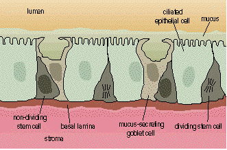 Figure 4. Cellular proliferation and death are kept in balance in normal, healthy tissues. This scenario might appear in any one of the tissues, such as the epithelium of the respiratory tract or the colon, where cells turn over and are replaced frequently in the course of normal use. Cells are bound on one end by the basal lamina and stroma, layers of collagen and other connective-tissue proteins that form a wall around the tissue. On the other end is the lumen, or the tube of tissue such as an airway. In this tissue, immature cells, also known as stem cells, lie dormant near the basal part of the epithelium until they receive a growth signal. Then they undergo the cell-division cycle and proliferate. The membrane of the cell nucleus remains intact inside cells preparing to divide. The nuclear membrane disappears during cell division itself when individual chromosomes become visible. Dividing stem cells differentiate and produce one of two mature cell types in this tissue. One type is the ciliated epithelial cell. Another type is the mucus-secreting goblet cell, which produces the mucus coating the lumen of this air passage.