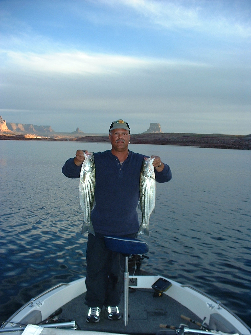 November 12, 2004 fishing with John Lassandro we took Stripers with three different techniques. Trolling. jigging and casting topwater lures in the Padre Bay area of Lake Powell. A majority of fish were in the 5 to 7 pound class.