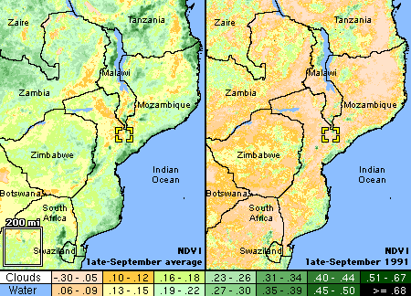 In 1995, three years after war ended, USAID asked the USGS to try documenting the migration of rural Mozambicans during the civil war using Landsat and other satellite data. These satellites can not see people, but they can see farms; for this reason, CUI was used again. In areas of subsistence agriculture, CUI approximates population density. CUI can also be used to spatially disaggregate agricultural statistics-- for example, if Sofala Province reports a 50% rise in planted grains, CUI can tell us where in the province the grains were planted.