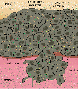 . Malignancy begins when cells break through the basal lamina and invade the stroma and underlying tissues.