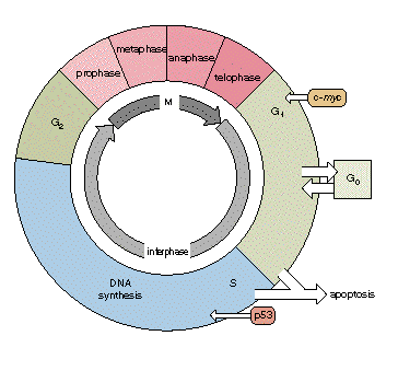 Figure 3. Cycle of events leading to cell division is under strict genetic control. Resting cells are in the phase called Gap0 (G0). During this period cells cannot divide, but they can differentiate by maturing and taking on the functions of the mature cell type. When cells receive external cues to divide they enter the cycle at the Gap1 (G1) phase. During G1, cells manufacture cellular components, such as RNA and proteins, in preparation for division. After a time, the cells enter the Synthesis (S) phase in which the cells DNA is duplicated. During the next phase, Gap2 (G2), the cell continues to manufacture proteins and RNA. Finally, the cell undergoes Mitosis (M), during which each daughter cell receives a complete set of the cells genes, along with all of the other constituents it needs to function and mature. To ensure that cell division equals apoptotic cell loss the cells response to growth cues is regulated, for example, by the protein Myc, encoded by the gene c-myc, which exerts its effects during the G1 phase of the cycle. In order that DNA be faithfully duplicated, checkpoints exist at certain steps of the cell cycle. The p53 protein mediates a checkpoint when the cell enters the S phase. If all is well, the cell continues with the cycle. But if the DNA is damaged, the cell cycle is stopped to allow for DNA repair. If the damage is so severe that it cannot be fixed, the cell exits the cycle and instead undergoes apoptosis. Mutations in the c-myc gene, in the p53 gene or in any of the many other regulatory genes, or the genes that encode proteins that correct defects in DNA, alter the cell cycle. Alterations lead the cell to proceed through the cell cycle with damaged DNA, which contributes to the kinds of chromosomal anomalies seen in Figure 2. These in turn lead to further deregulation of the cell cycle such that cellular proliferation is excessive, and apoptosis reduced. The net effect is an overabundance of cells, which is basically the situation in cancer.