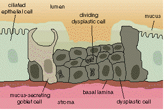 Figure 5. Dysplasia represents an initial stage in cancer formation. Dysplastic cells differ from normal cells in their shapes and the size of their nuclei. The growth cycles of some of the cells have become abnormal, and dividing cells form an abnormally high percentage of the total cellular population. At this point, too, dividing stem cells are no longer limited to the basal portion of the epithelium.