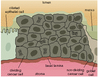 Figure 6. In carcinoma in situ, changes characteristic of dysplastic cells become more pronounced. The cells look like cancer cells. At this stage the cells are largely undifferentiated and dividing. Cells, however, are still contained within the basal lamina and are separated from the stroma.