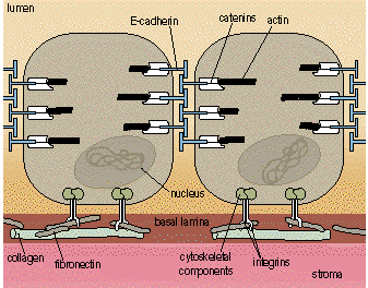 Figure 7. Network of protein connections hooks normal epithelial cells tightly in place in a tissue. E-cadherin molecules span the membranes of epithelial cells and hook into E-cadherin molecules on adjacent cells. E-cadherin also projects into the cellŐs interior and hooks into the proteinacious skeleton, called the cytoskeleton, which supports the cellular structure. E-cadherin links with actin molecules in the cytoskeleton via a set of molecules called catenins. Epithelial cells are also molecularly connected with collagen and other proteins in the basal lamina. Integrins spanning the epithelial-cell membrane bind with fibronectin, which in turn binds with collagen in the basal lamina. Like E-cadherin, integrin molecules also project into the epithelial-cell interior and bind with actin in the cytoskeleton. Before cancer cells can spread to foreign organs, they must break all of these bonds.