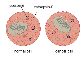 Figure 8. Metastatic cancer cells must penetrate the connective tissue of the basal lamina and the stroma before they can exit an organ. The cells do this by employing proteases, protein enzymes that chew apart other proteins, such as the collagens in connective tissue. Proteases such as cathepsin-B are normally housed in membrane-bound vesicles, called lysosomes, inside the cell. There, they help degrade cellular proteins to their constituent parts to be excreted or recycled to form new proteins. Cancer cells seem to express cathepsin-B on their membrane surfaces as well. Cathepsin-B is one of several proteases, some of which may be expressed and secreted by normal cell types, that help the cancer cell escape its parent tissue and enter the bloodstream.