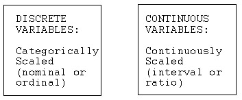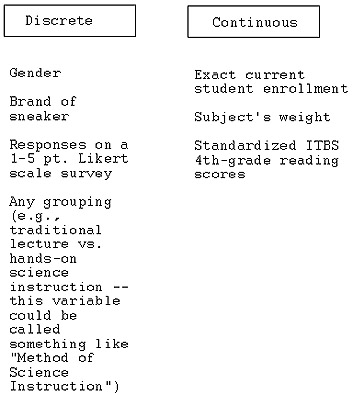 Also, one reminder about the above 2 labels: the terms "discrete" and "continous" apply ONLY to those variables that are QUANTIFIABLE. They wouldn't be pertinent to QUALITATIVE (in words) data or variables, such as "Teachers' attitudes towards unionization," IF this variable is being measured by interviewing teachers and recording their attitudes in words.